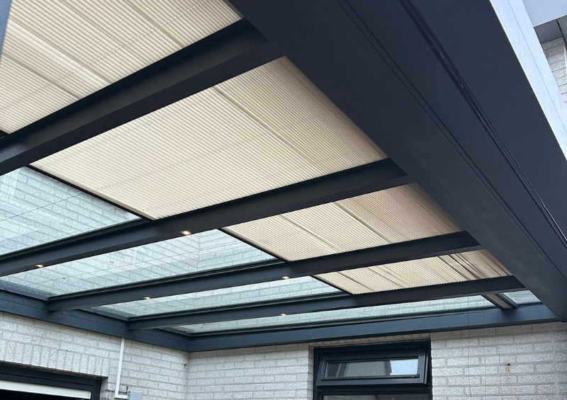 Bovendien kunt u ook een glazen schuifdak combineren met een mooie zonnescherm. In dat geval bevat het systeem naast glazen panelen ook ondoorzichtige onderdelen, die over of onder het dak kunnen schuiven. Hiermee wordt u beschermd tegen de zon, voor een aangenaam verblijf in uw veranda.